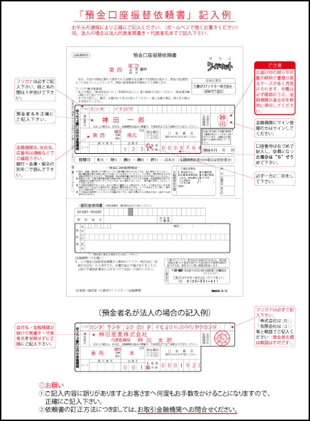口座振替をご希望の方は、「預金口座振替依頼書」を下記よりダウンロードいただき、記入例に沿って必要事項を記入してください。